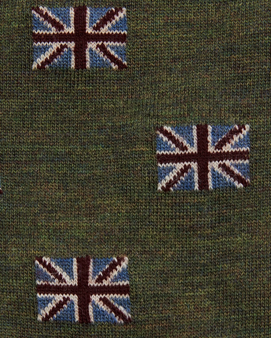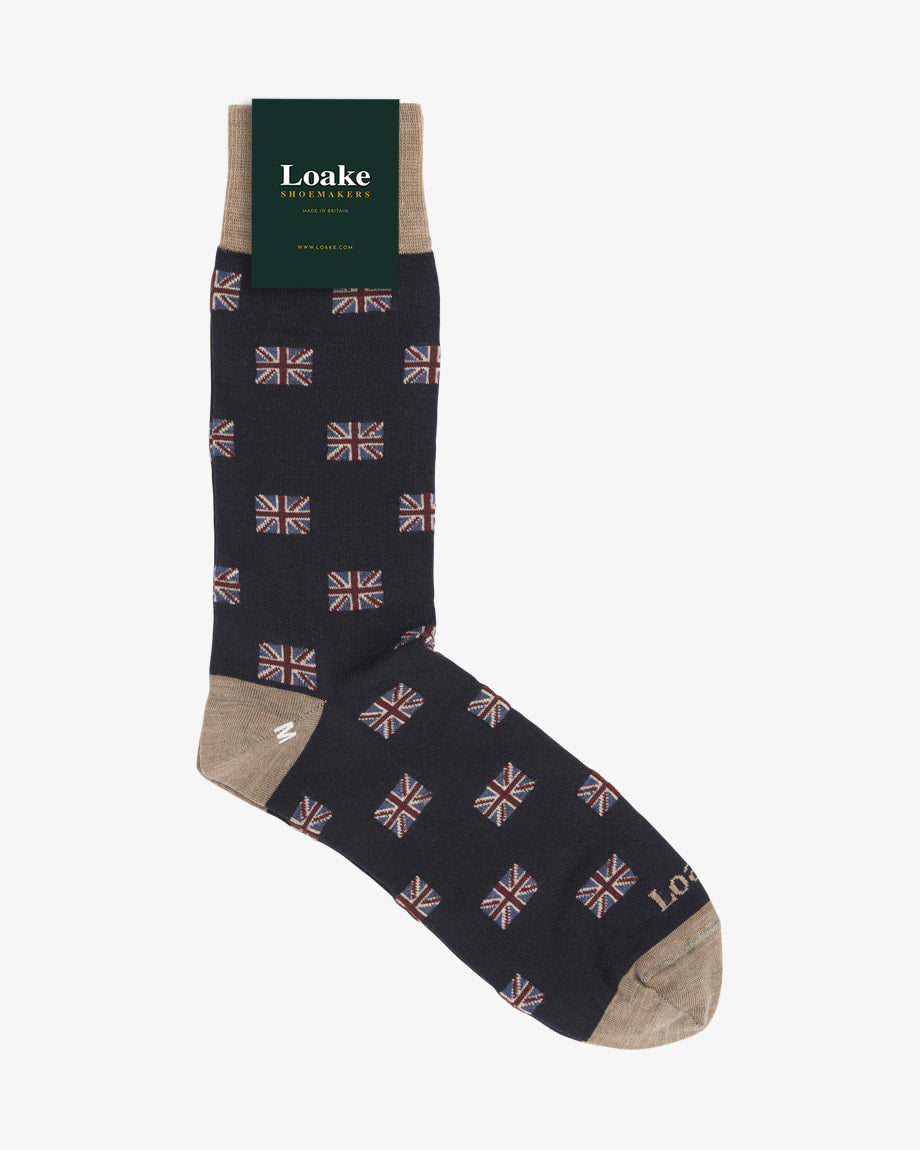 Premium wool socks with a navy background and Union Jack pattern. Made in Britain, from 63% wool and 37% nylon.